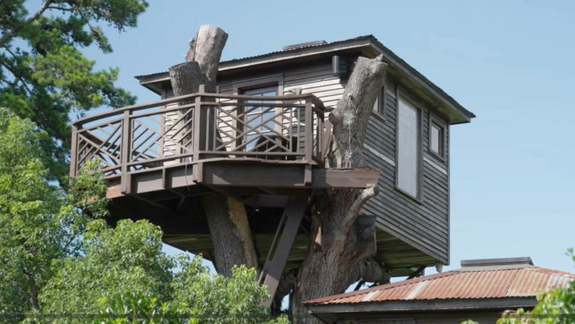 Construită în colaborare cu celebrul meșter Pete Nelson, prezentatorul emisiunii Treehouse Masters de pe Animal Planet, casa din copac a fost unul dintre cele mai ambițioase proiecte ale acestuia. Structura include un living confortabil, un dormitor spațios, o baie complet funcțională și chiar un tobogan tradițional — detaliu care adaugă un strop de copilărie luxului.