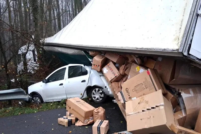 Un tir plin cu colete a lovit un autoturism și s-a răsturnat în afara carosabilului, direct peste o altă mașină oprită pe banda de urgență! Din fericire, în autoturismul staționat nu se afla nicio persoană în acel moment.